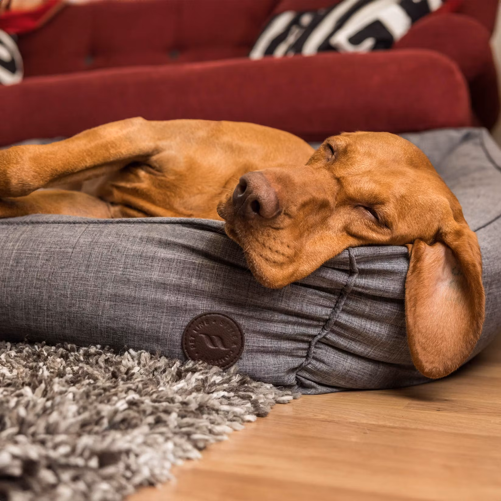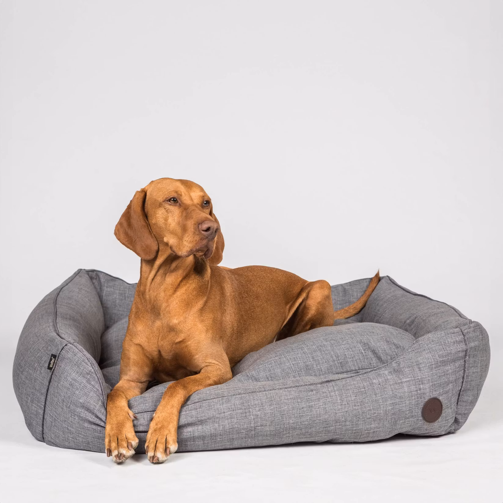 Hundbädden "Rocky" förenar stilren design med både praktisk funktion och Welltex®-effekt. Det gråmelerade tyget gör att den passar in i alla hem.