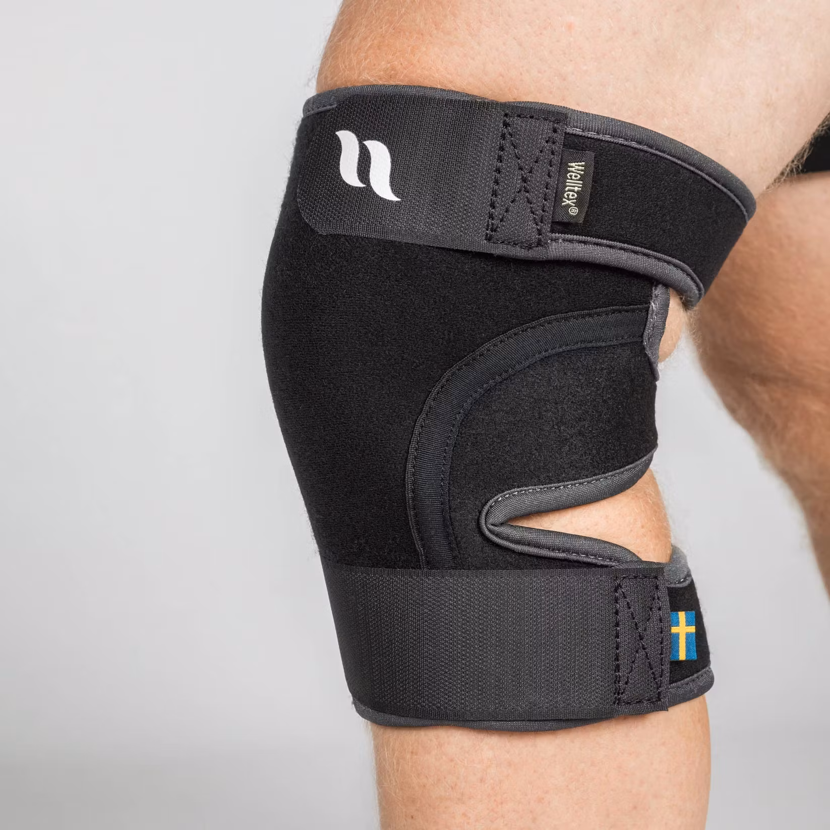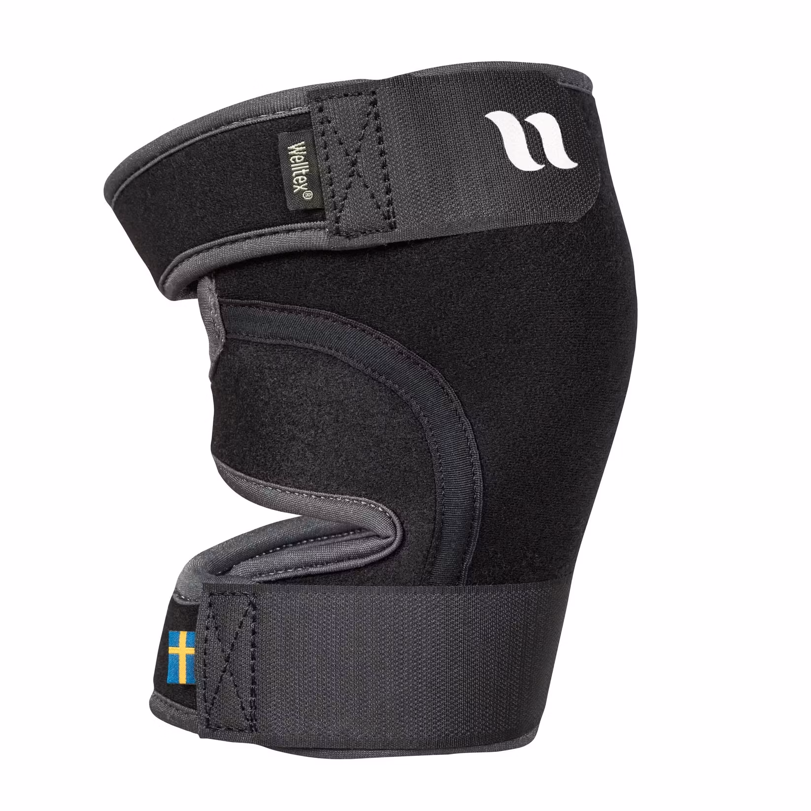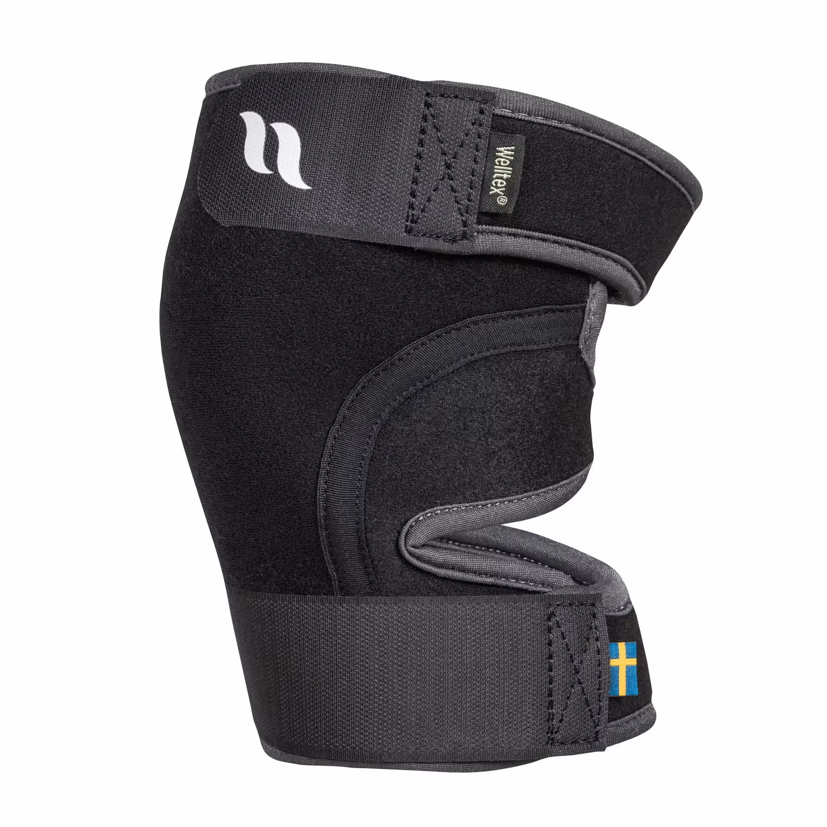 Justerbart knäskydd i stadigt material som omsluter och ger stöd åt knäleden. Hela insidan är fodrad med reflekterande Welltex®-teknologi, som kan öka blodcirkulationen i området och bidra till god muskel- och ledhälsa.