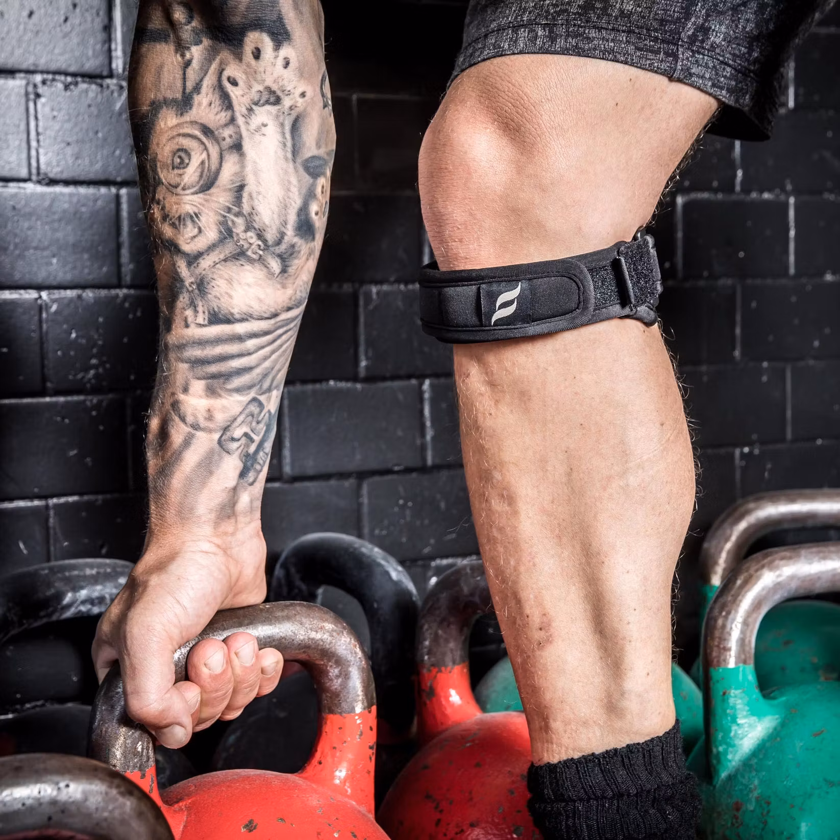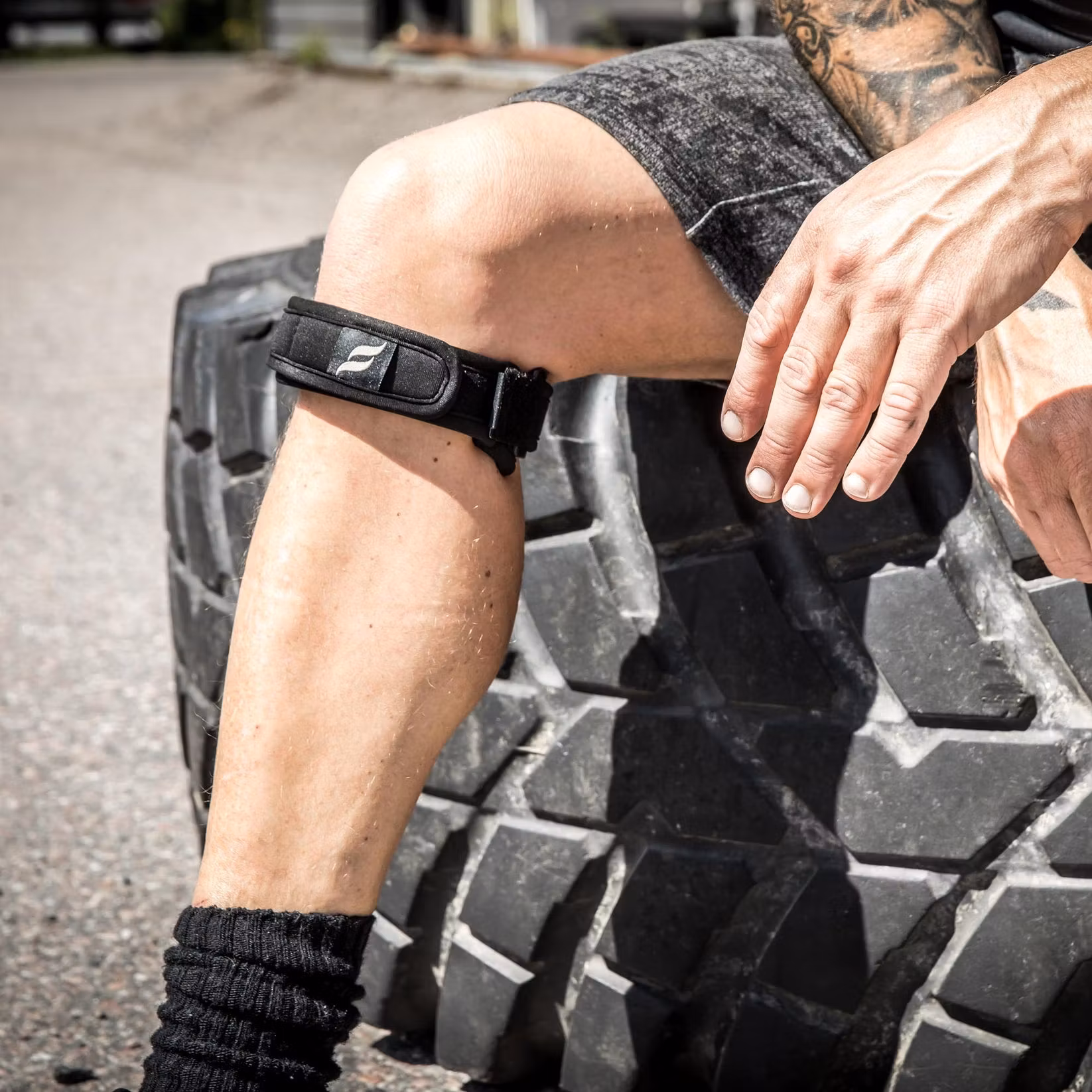 Avlastande, justerbart knäband med inbyggd pelott, avsett att lindra besvär vid patellofemoralt smärtsyndrom (PFSS) eller andra knäproblem - som exempelvis hopparknä.
