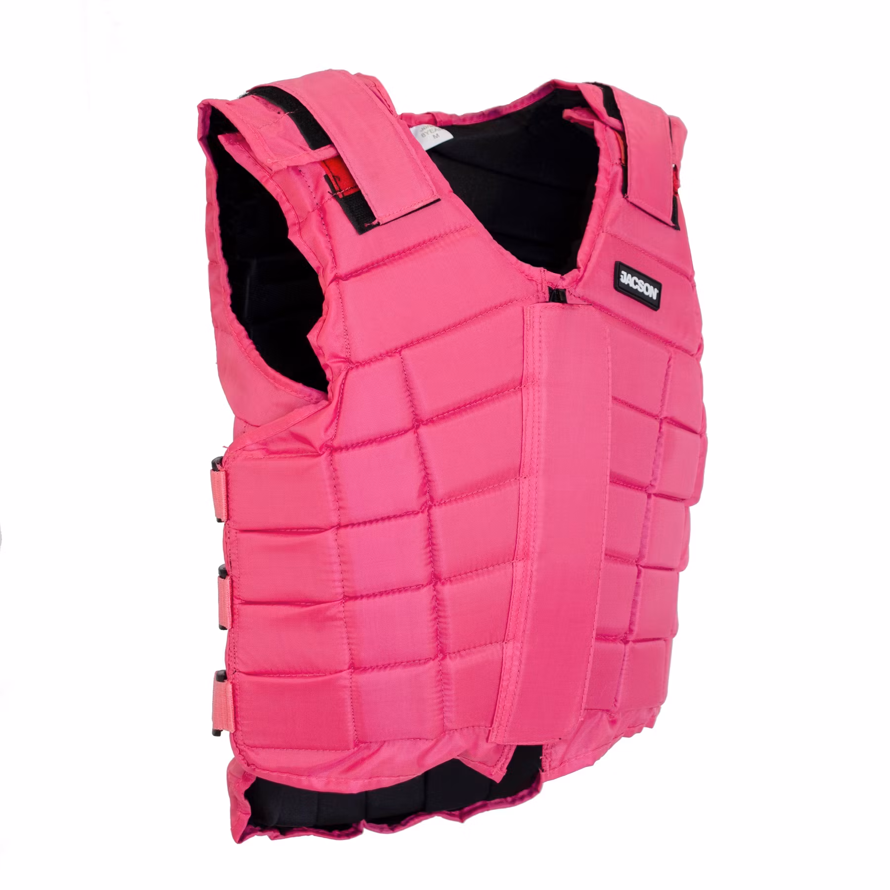 Denna säkerhetsväst från Jacson är designad för att ge bra rörelsefrihet tack vare separata paneler, och den har en dragkedja framtill, kardborre i sidor och på axlar för att ge en säker och bekväm passform. Västen finns i både svart och rosa, så du kan välja den färg som passar dig bäst. Dessutom är den lätt att hålla ren och torka av, så du kan använda den igen och igen utan problem. Säkerhetsvästen är CE-märkt enligt europeisk standard, EN 13158:2018, Nivå 3. Säkerhetsvästen uppfyller därmed kraven för att användas inom ridsport och vagnskörning, inga andra sporter. Det är viktigt att säkerhetsvästen justeras korrekt och att den känns bekväm. Säkerhetsvästen ska sitta nära kroppen över lätta kläder. Ytterligare plagg, till exempel en jacka, bör sitta över säkerhetsvästen. Du kan justera säkerhetsvästens passform vid axlarna och i sidorna. Säkerhetsvästen ska helt täcka revbenen, men den ska inte vidröra sadeln eller låren då du sitter.